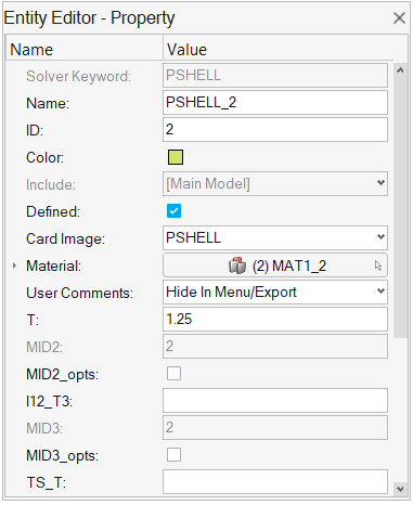 このエンティティエディターは、ブラウザまたはモデリングウィンドウのいずれかから選択されたエンティティデータを表示します。エンティティエディターヘッダーには、選択されたエンティティのタイプが表示されます。Name列にはエンティティの属性が表示され、対応する値は Value列に表示されます。グレーで表示されているテキストの属性は編集できません。エンティティエディター内で行われた修正は、自動的にモデル全体に適用されます。
