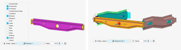 図 3に示す例では、選択された要素の半径50以内にあるコネクター、荷重、座標系とともに、すべての有限要素が検索されます。