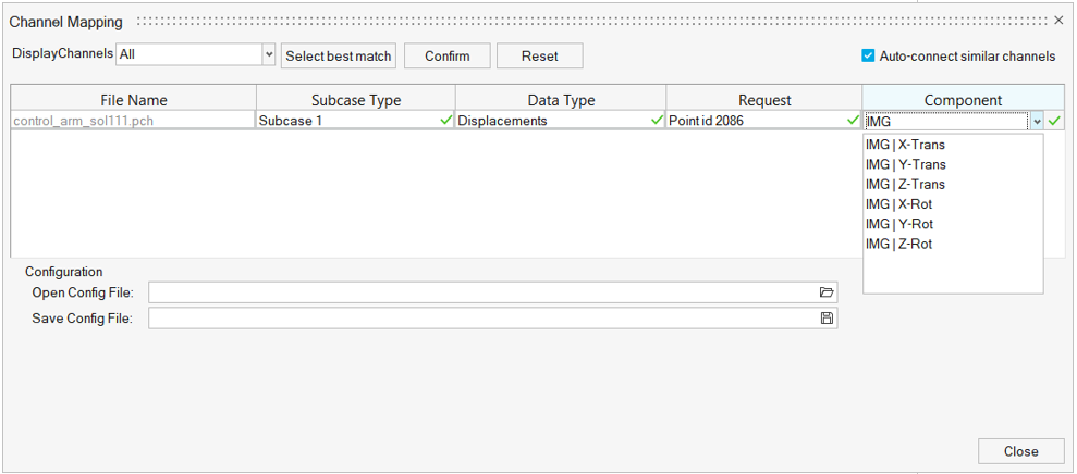 Channel Mappingダイアログ には、各欄に表示されるリストに関連するオプションの表示とフィルタリング機能に加え、Subcase Type、Data Type、Request、およびComponent の各チャネルをマッチングさせるためのフィルタリングや並び替え機能があります。ワイルドカードには対応しません。