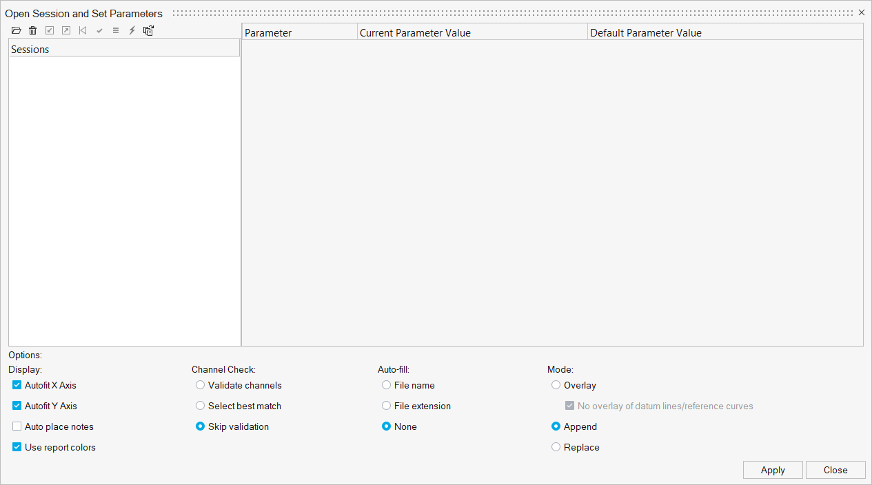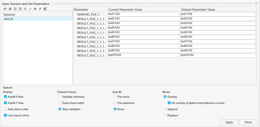 Parameter列には、テンプレートのデータファイル群がリストされます。Current Parameter Value列には、セッションに使用されているファイル名が表示されます。