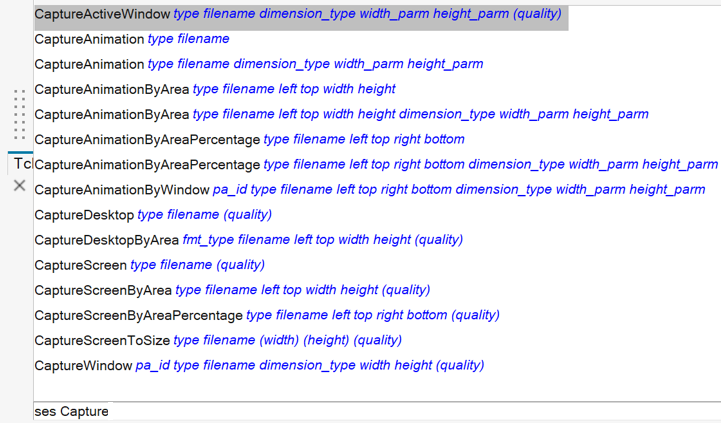 この例では、Captureという語が入力されているため、コマンドのリストは長くなっています。Intellisenseポップアップウィンドウのサイズは、グラフィックス領域の高さによって制限されます。図 6.