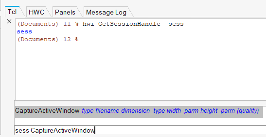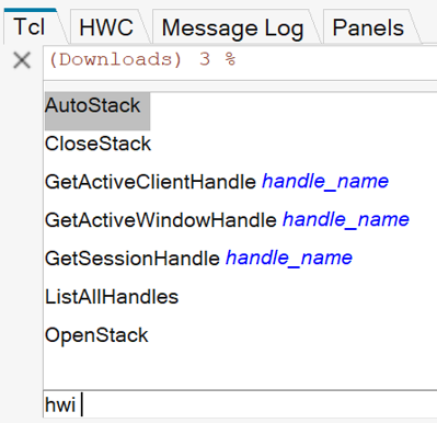 Intellisenseウィンドウは、ハンドル名(またはハンドルが割り当てられている変数)がコンソールに入力されると表示されます。例えば、コンソールにhwiと入力すると、下の図に示すとおり、Intellisenseウィンドウは有効なコマンド名をリストします。図 5. ハンドル名