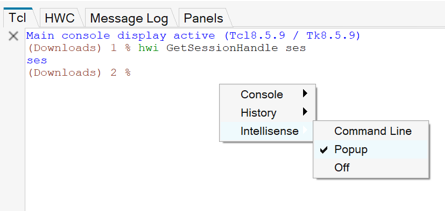 - コマンドラインをアクティブにすると、コンソールの下部に Tcl/Tk コマンドラインが表示されます。Tclハンドルを含むコマンドを入力すると、コマンドラインの上にIntelliSenseポップアップウィンドウが表示されます。PopupモードでAPIを選択すると、Intellisenseウィンドウは解除されます。