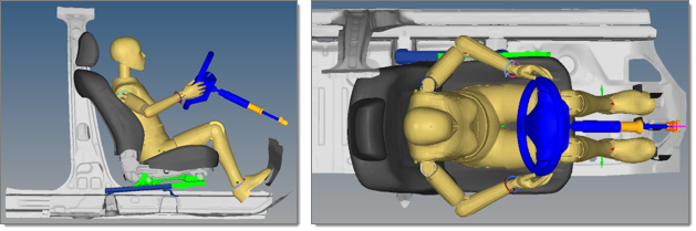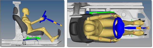 車両の有限要素モデルでは、Mechanismブラウザを使用して、シート、ハンドル、ペダルなどの動的システムをさまざまな位置に迅速、効率的に設定します。