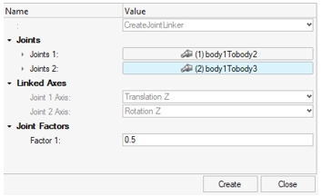 Dummy bodies (child bodies)ダイアログで、ダミーのセカンダリボディとリンクしている自由度を選択し、Closeをクリックします。