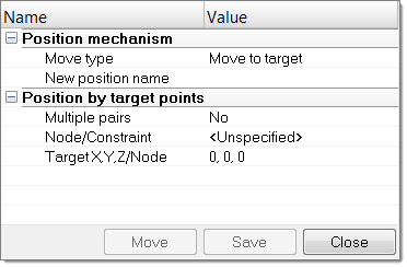 - Target Pointを選択してエンティティエディターを開き、を開き、節点を選択してそのターゲット位置を定義します。Moveをクリックして各ボディの位置を計算します。ジョイントの制限値に応じて、選択した節点をターゲット位置またはそれに最も近い位置に配置します。Multiple pairsをYesに設定することで、このオプションを複数の節点と複数のターゲットに適用できます。