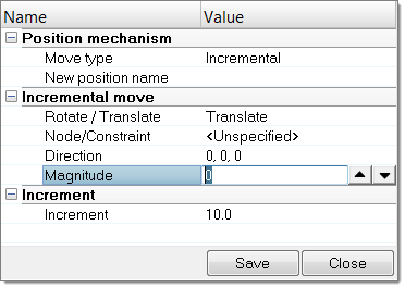 - Translateを選択してエンティティエディターを開きます。Node/Constraintを選択し、運動の方向(Direction)を指定して、適用する平行移動の量(Magnitude)を定義します。上下の矢印ボタンを使用してMagnitudeを修正することもできます。また、Incrementの値を変更して操作の増分値をコントロールできます。