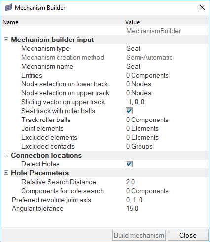 | Seat Track with Roller Balls | Mechanism TypeにSeatが設定されている場合、シートトラックにローラーボールを装備するかどうかを指定できます。このオプションをオンにすると、HyperMeshによってシートトラックにダブルスライダージョイントが自動的に作成され、シートトラックのローラーを選択する機能が新たに表示されます。 |