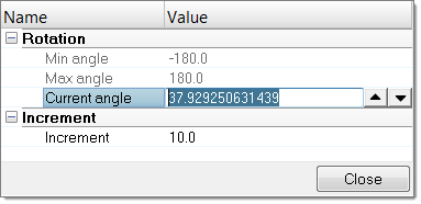 - Rotateを選択してエンティティエディターを開きます。ボディを選択し、回転軸(Rotation axis)と回転の中心(Base point)を定義して、ボディに適用する回転量(Magnitude)を指定します。上下の矢印ボタンを使用してMagnitudeを修正することもできます。また、Incrementの値を変更して操作の増分値をコントロールできます。