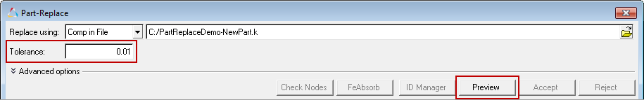 Toleranceフィールドで、ターゲットパートとモデル間の結合やその他の参照を再確立するための最も近い節点と要素の検索するためのトレランス値を入力します。