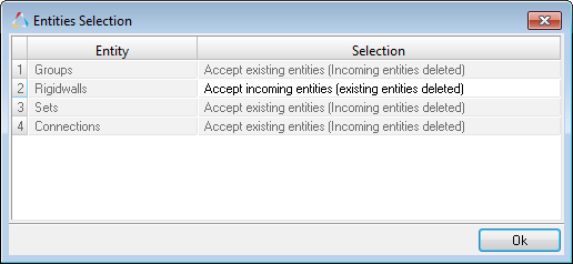 Entities Selectionダイアログで、入ってくるエンティティと既存のエンティティの置換方法を指定して、OKをクリックします。