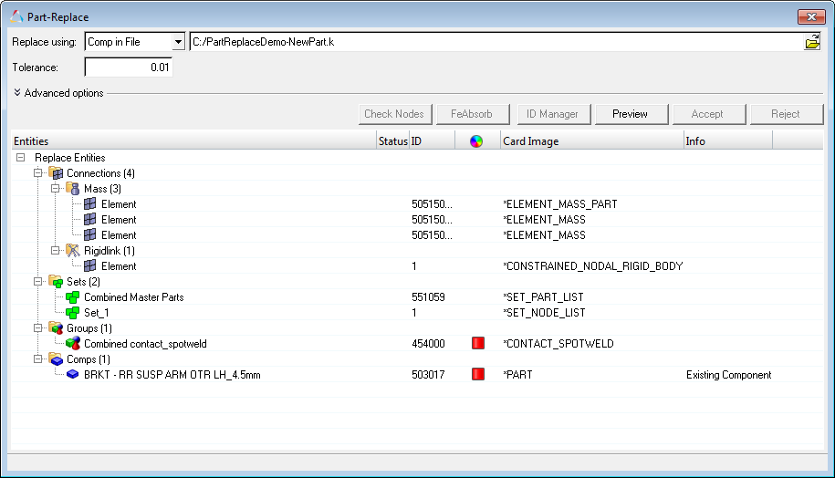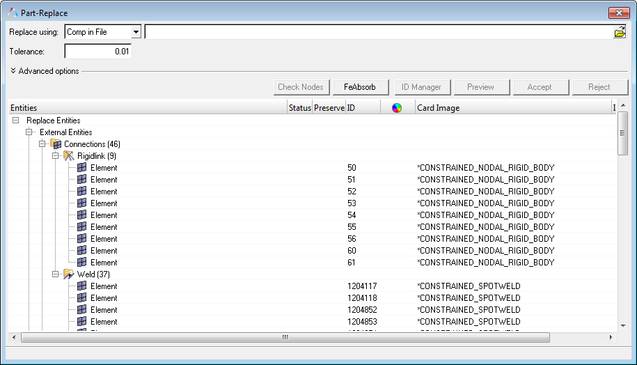 - オプション: preserveと指定された外部および内部結合は、パート置換時に自動的に保持されます。吸収されるコネクターを現在のインクルードファイルに移動するには、FeAbsorbをクリックします。