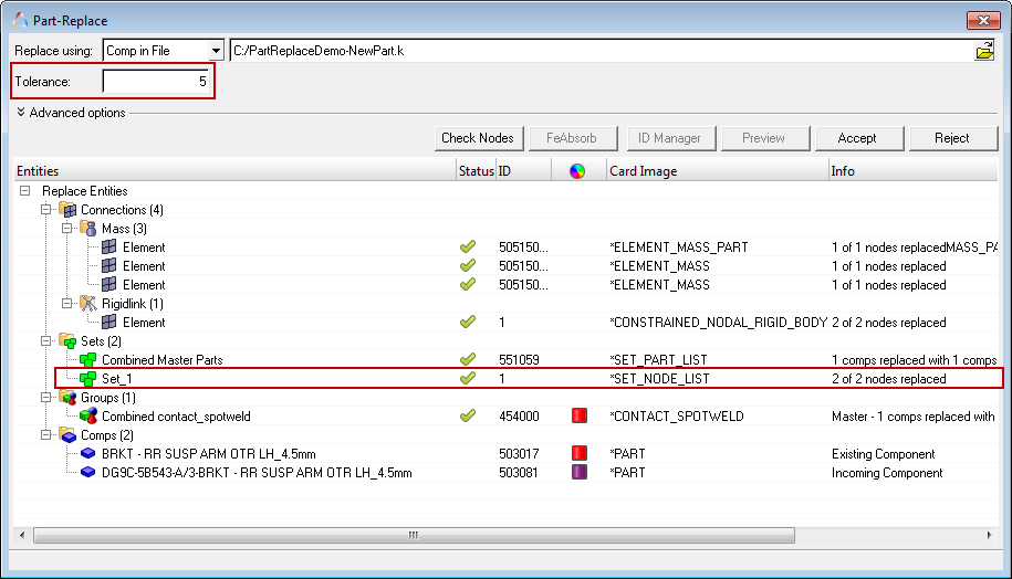 Toleranceフィールドで、ターゲットパートとモデル間の結合やその他の参照を再確立するための最も近い節点と要素の検索するための値を入力します。