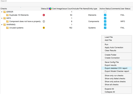 5. オプション: Model Checker内の空白スペースを右クリックし、コンテキストメニューからExport Resultsを選択することで、実行されたチェックの詳細レポートがエクスポートされます。Export detailed CSV reportを選択すると、すべての列をエクスポートすることができます。