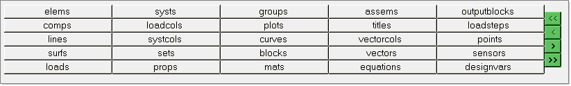 一連の選択肢(エンティティセレクター)が定義されているパネルでは、ラピッドメニューで次のコレクターに移動します。例えば、Ruledパネルでは、最初の節点リストまたはラインリストでいくつかの節点を選択し、マウスの中央ボタンをクリックすると、2つ目の節点リストに移動し、さらに節点をピックできるようになります。選択肢にはっきりした順序のないパネルでは、マウスの中央ボタンはデータが十分ではない機能をアクティブにし、その結果エラーメッセージが表示される場合もあります。例えば、TranslateパネルでN1, N2, N3ベクトルオプションを使って節点を移動させる場合、必要な節点を選択した後に中央ボタンをクリックすると、translate +を実行しようという試みがなされます。N1、N2、N3が選択されていない、もしくは大きさの値が入力されていない場合は、エラーメッセージが表示されます。