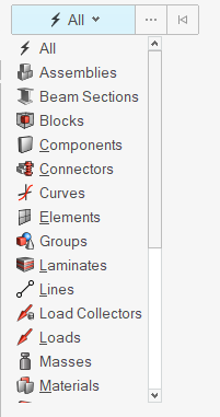 エンティティセレクターはブラウザ内の選択には影響を及ぼしません。モデリングウィンドウ内のエンティティセレクターは、選択されたentityタイプに合うように自動的に更新されます。ブラウザでは、異なるタイプの複数のentitiesを選択することもできます。