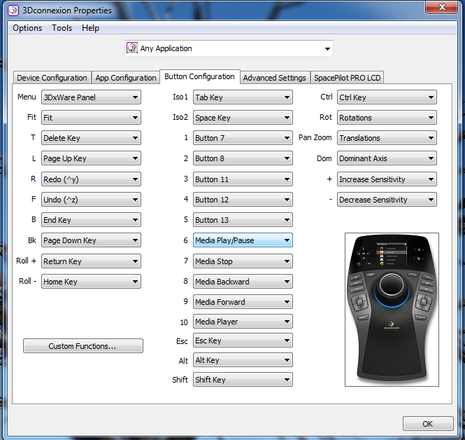 SpaceMouseデバイス上のボタンはプログラム可能で、これらのボタンの使用を最適化するにはユーザーによるカスタマイズが必要な場合もあります。各ボタンは3Dconnexionコントロールパネルを使用し、キーボードキーを押した場合やボタンを押した場合の動作の割り当て、あるいは3Dconnexionコントロールパネルの設定をプログラムすることができます。例えば、3DconnexionコントロールパネルのCustom Functionsボタンを使って、SpaceBall/SpaceMouseデバイスのボタン1をHyperViewキーボードショートカット'M'(メッシュライン表示の切り替え)に割り当てることが可能です。図 1. 3Dconnexionコントロールパネル - SpacePilotボタン設定(Windows)のサンプル