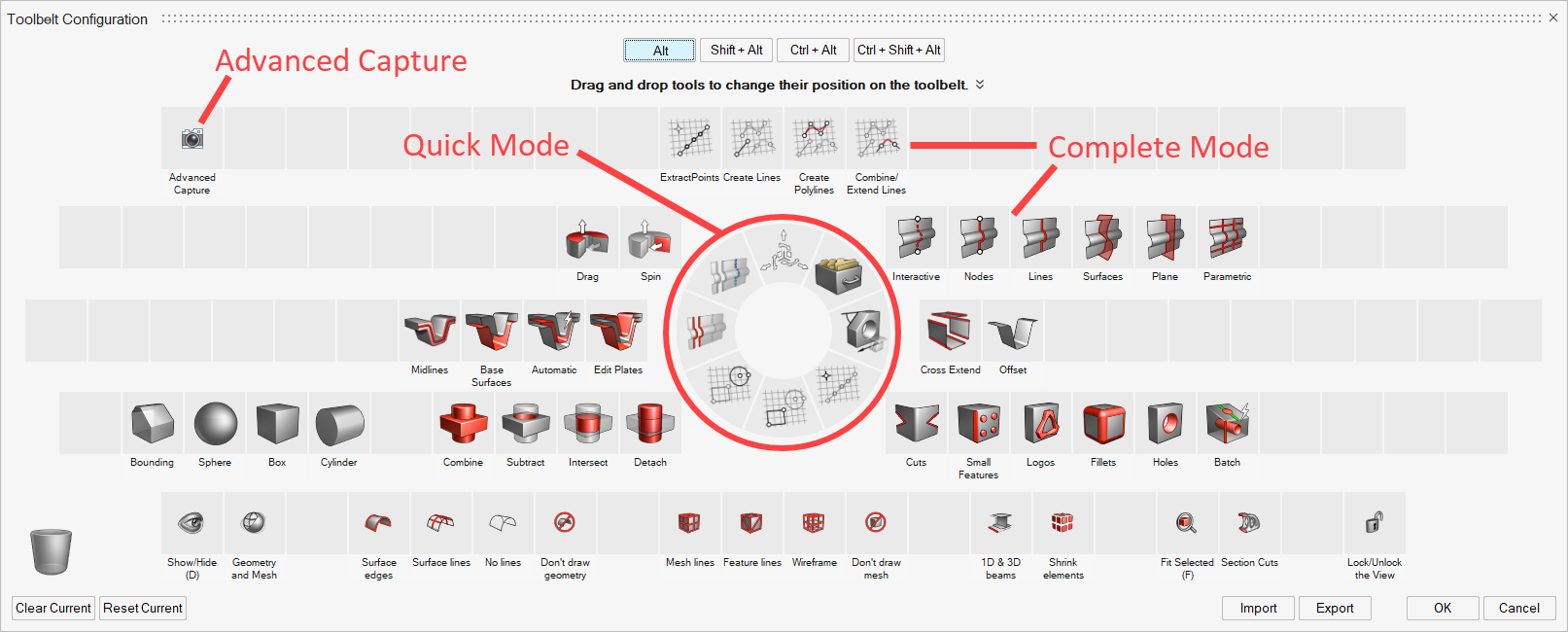 すべてのリボンからツールベルトの設定モードにアイコンをドラッグアンドドロップするだけでツールベルトをユーザーの好みに合わせて調整できます。