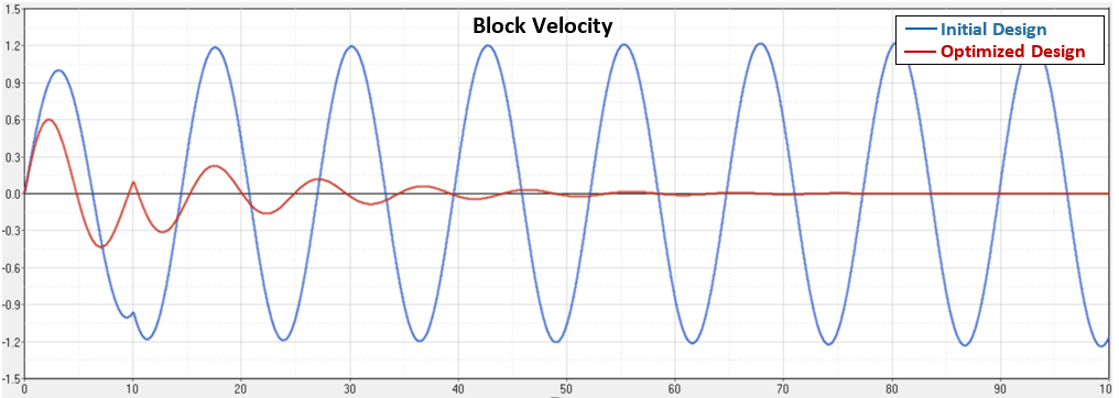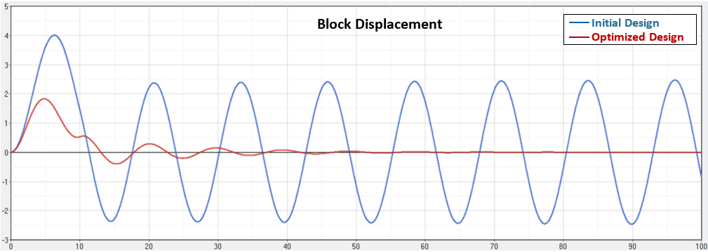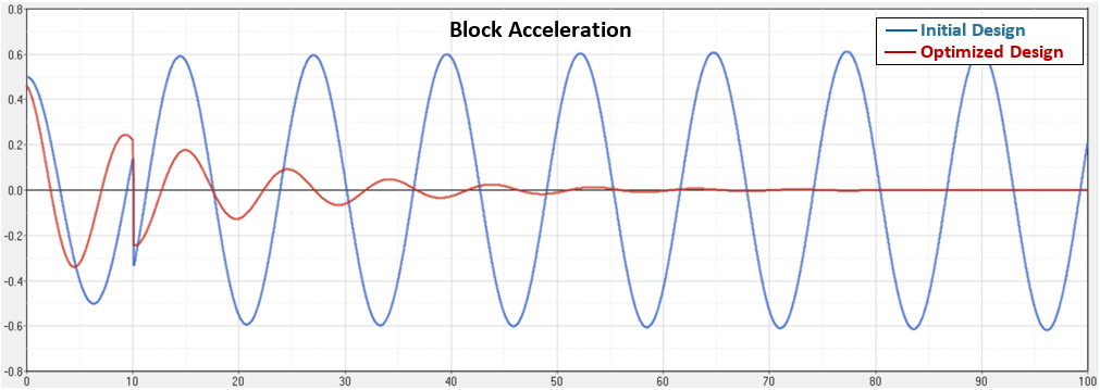 初期設計と最適化した設計の両方について、このブロックの動的応答をプロットしています。変位、速度、および加速度が改善されています。