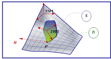 - サーフェスS上の接触ポイントPの座標は、1101の原点を基準にして[0.3, -3.0, 1.1]とします。これらの座標は、1101の座標系で測定されたものです。
