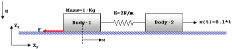 このモデルは1次元の問題を示しています。運動は全体座標系のX軸方向のみとなります。このシステムは、ボディ1とボディ2の2つの質点からなり、これらは剛性K = 2 N/m。のスプリングによって結合されています。各ボディの質量は1Kgです。これらのボディは全体座標系XY平面に配置されています。ボディ2の質量中心において、全体座標系のx軸方向に、0.1*timeというモーションが適用されます。ボディ1の質量中心はマーカー666で示されています。座標xによって、ボディ1のx方向の変位が定義されます。これは、MotionSolveの式DX(666)によって測定されます。ボディ1の滑り速度は、式VX(666)によって測定されます。