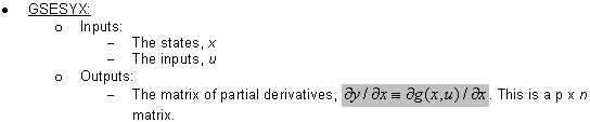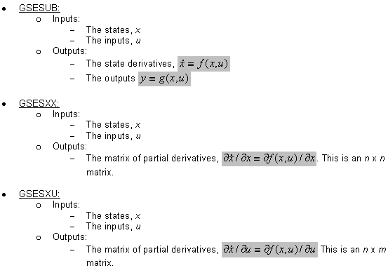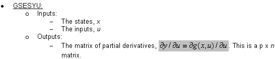 - "USERSUB"バージョンのControl_StateEqnは、ユーザー定義サブルーチンで定義されるほとんどのモデリング要素より複雑です。5つのユーザーサブルーチンが必要となることがあります。まず、GSESUBが必要です。残りの4つ、GSEXX、GSEXU、GSEYX、GSEYUは、stiff積分器(VSTIFFまたはMSTIFF)が使用される場合にのみ必要となります。