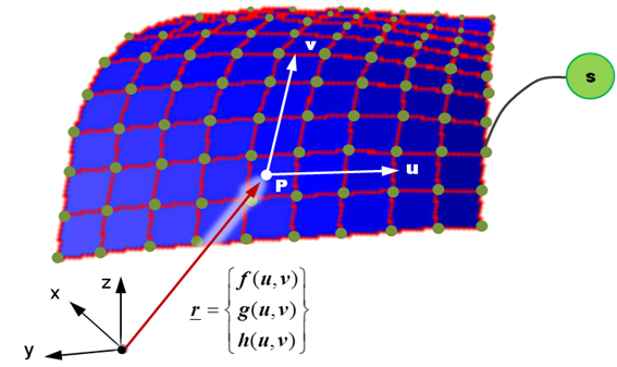 サーフェス上の任意のポイントPのOXYZでの座標は、自由パラメータu、vについての3つのキュービックスプライン関数f(u,v)、g(u,v)、およびh(u,v)で一意に表すことができます。