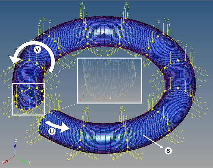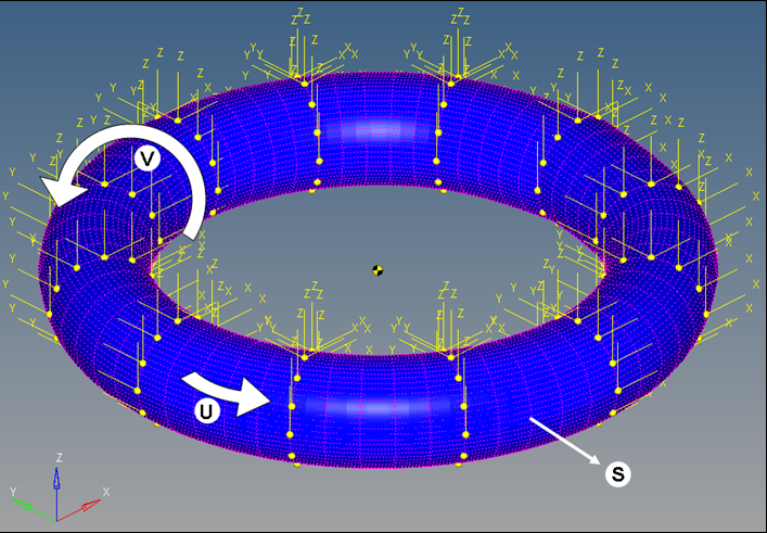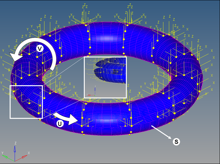 下の図は、閉じたサーフェスを定義する方法を示しています。この図には、U、Vの方向が示され、変形可能サーフェスがSとラベル付けされています。