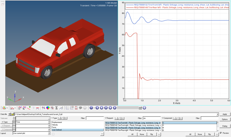 Tire-Front-Left - Plastic sinkage, …とAutoTirePair- Tire-Rear-Left - Plastic sinkage, …を選択します。フロントタイヤとリアタイヤの土壌沈下を解析するには、Y componentでF2を選択します。