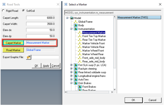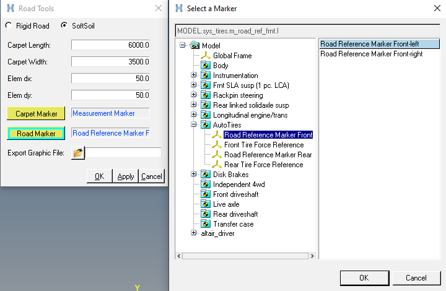 軟質土壌地形を視覚的に表現するためにカーペット路面が使用されます。これにより、HyperViewでのアニメーションのポスト処理中に土壌沈下を示す平坦なサーフェスが作成されます。カーペットはカーペットマーカーに取り付けられます。マーカーが車両に追従して移動する場合、カーペットグラフィックスも車両に追従して、カーペットがタイヤと接触している領域での軟質土壌の変形を示します。カーペットマーカーがグラウンドボディまたはその他の静止したボディに取り付けられた場合は、カーペット路面グラフィックスも静止状態となり、車両が乗り越えたときに土壌沈下が見られます。