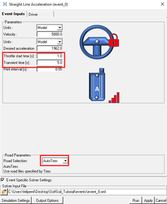 secに変更し、Road SelectionドロップダウンメニューからAutoTiresを選択します。シミュレーションファイルのパスの場所を入力し、Runをクリックします。