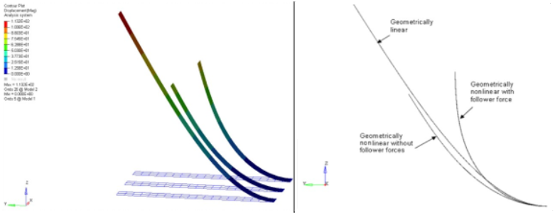 図 2 はまた、追従荷重の適用の有無と幾何学的線形と非線形解析での変形特性の違いを示しています。