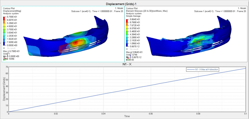 車のバンパーは1次シェル要素を使用してモデル化され、マウンティング位置において全自由度が拘束されています。ストッパー / インパクターは剛体1次シェル要素 + 慣性効果を与えるために質量が付加されたRBE2で、これはX並進以外のすべての自由度が拘束されます。スライディング接触は、バンパーのサーフェス(衝突中にストッパーと接触する領域)間およびストッパーサーフェスについて定義されます。初期速度(ストッパーに付与される)は、-694.44mm/sです。
