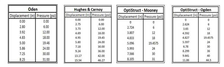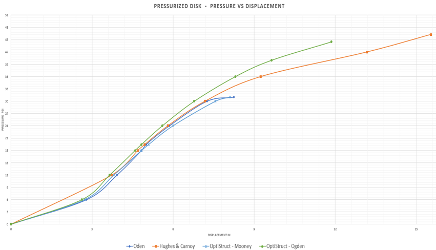 The Mooney and Ogden material model runs correlate very well in the pressure range