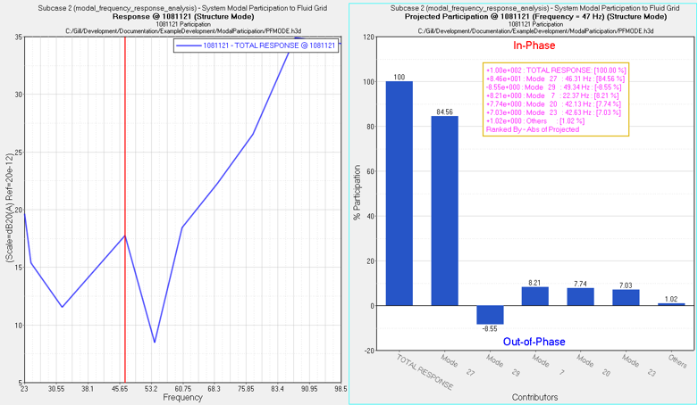 結果のポスト処理には、HyperViewのModal/Panel Participationユーティリティを使用します。NVH問題が発生する周波数を選択し、それに最も寄与する構造 / 流体のモードを確認します。図 2. Bar Plotフォーマットでの特定の周波数における一番の要因