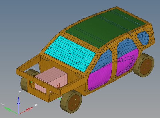 モード寄与は、特定の周波数における応答への構造または流体モードの複雑な寄与を表します。モード寄与は、モードが適切に分離されている、すなわちモード密度が低い際に、低周波数NVH問題を診断する一助となります。図 1. 簡素化した車両モデル
