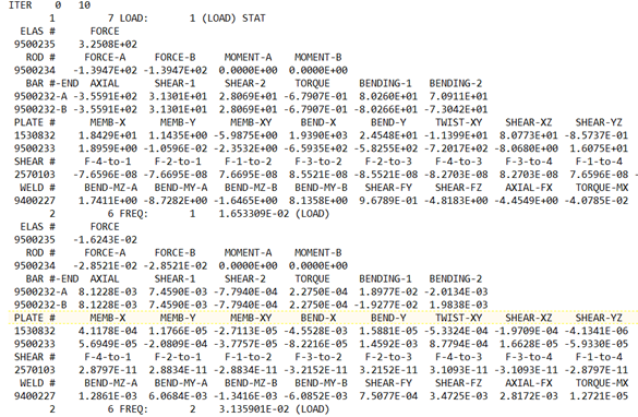 結果タイプ 解析タイプ DISPLACEMENT 線形静解析、ノーマルモード解析、線形座屈解析。 DISPLACEMENT REAL/IMAGフォーマットまたはMAG/PHASEフォーマットによる周波数応答解析(直接法とモーダル法)。 VELOCITY ACCELERATION SPCFORCE 線形解析、周波数応答解析(直接法とモーダル法)*。 MPCFORCE - 要素に基づいた結果: