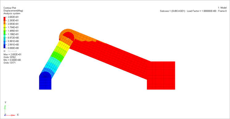 ここでの目的は、JOINTGを使ってスライダー-クランクモデルの大変位非線形解析を行うことにあります。水平な強制変位が、SPCエントリを使って、ブロックの1端で負のX方向に付与されています。モデルは図 1に示すとおりです。