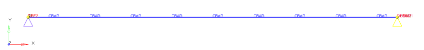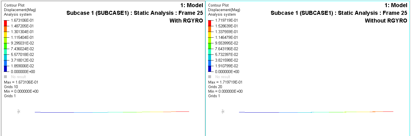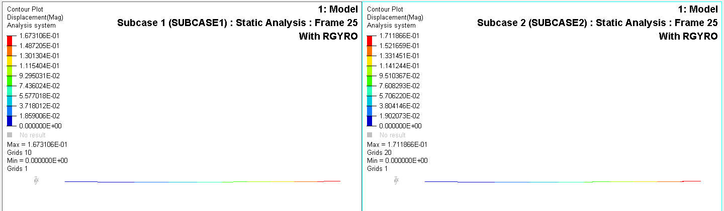 この例は、1次元要素を用いてモデル化された2つの同軸ローターで構成されています。各ローターの同一端は剛体要素を用いて固定子に取り付けられ、他端はスプリング要素とダンパ要素を介して固定子に取り付けられています。ローターに遠心力による静荷重がかかる状態と、2つのローター間の相対的なスピンを定義しています。最大回転数を変えて同期解析と非同期解析を行います。