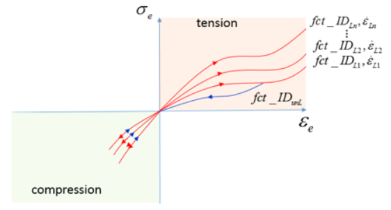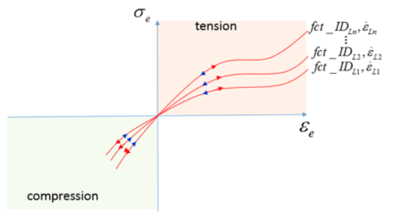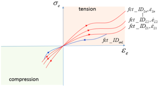 に必要な項の数は、適合する実験データの範囲と望まれる曲線フィッティングの精度に依存します。実践的には、3つの材料ペアがほとんどのデータに適合します。特定の材料について材料ペアが既知ではない場合、単軸試験データの曲線フィッティングがLAW69を用いてRadioss で、もしくは別のフィッティングソフトウェアを介して行うことが可能です。