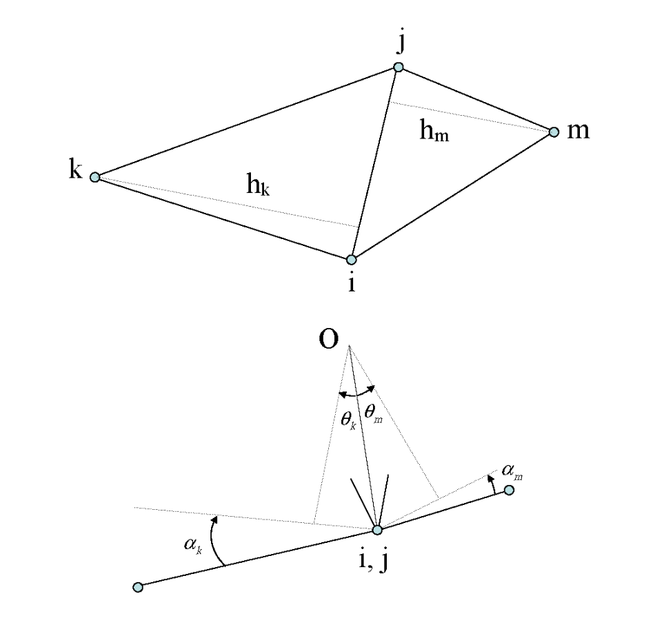 Consider two adjacent coplanar elements with a common edge i-j as shown in 図 2. Due to out-of-plane displacements of nodes and , the elements rotate around the side i-j. The angles between