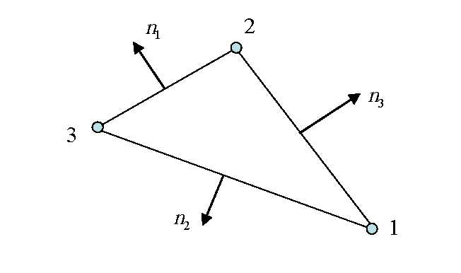 Consider the triangle element in 図 2. The outward normal vectors at the three sides are defined and denoted , and . The normal component strain due to the bending around the