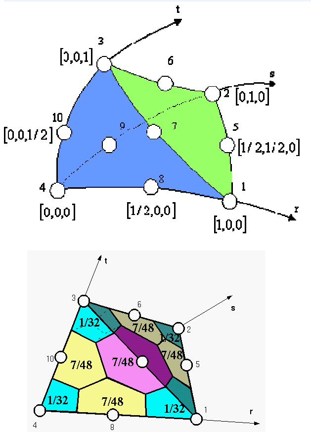 with 4 integration points and a quadratic shape function as shown in 図 1.図 1. (a) Isoparametric 10 Node Tetrahedron; (b) Nodal Mass Distribution