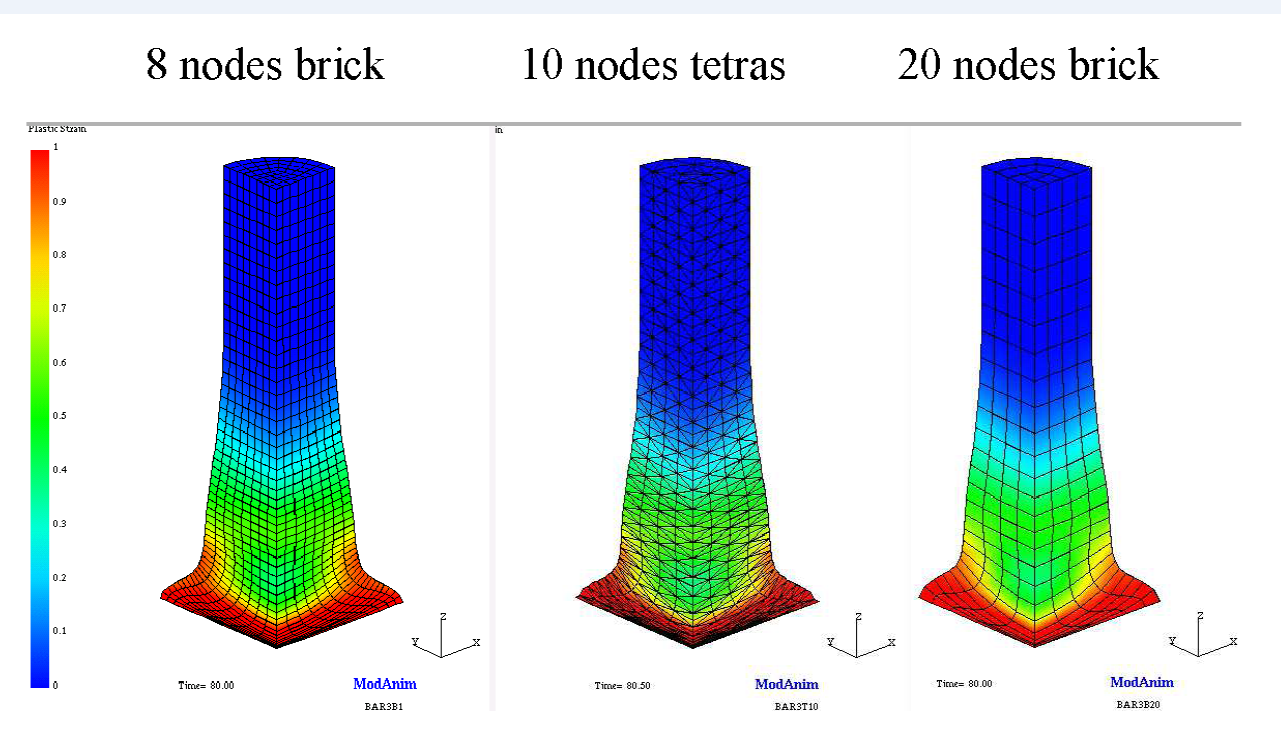 Below is a comparison of the 3 types of elements (8-nodes brick, 10-nodes tetra and