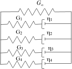 Generalized Maxwell-Kelvin Model for Viscoelastic Materials (LAW40) This law may only be applied to solid elements. Bulk behavior is assumed to be linear:図 1. d p d t = K ε ˙ k k MathType@MTEF@5@5@+= feaagKart1ev2aaatCvAUfeBSjuyZL2yd9gzLbvyNv2CaerbuLwBLn hiov2DGi1BTfMBaeXatLxBI9gBaerbd9wDYLwzYbItLDharqqtubsr 4rNCHbGeaGqiVu0Je9sqqrpepC0xbbL8F4rqqrFfpeea0xe9Lq=Jc9 vqaqpepm0xbbG8FasPYRqj0=yi0dXdbba9pGe9xq=JbbG8A8frFve9 Fve9Ff0dmeaabaqaciGacaGaaeqabaWaaeaaeaaakeaadaWcaaqaai aadsgacaWGWbaabaGaamizaiaadshaaaGaeyypa0Jaam4saiqbew7a LzaacaWaaSbaaSqaaiaadUgacaWGRbaabeaaaaa@3FC0@ Shear behavior is computed using a shear factor as:図 2. G ( t ) = G ∞ + ∑ 1 5 G i e − β i t MathType@MTEF@5@5@+= feaagKart1ev2aaatCvAUfeBSjuyZL2yd9gzLbvyNv2CaerbuLwBLn hiov2DGi1BTfMBaeXatLxBI9gBaerbd9wDYLwzYbItLDharqqtubsr 4rNCHbGeaGqiVu0Je9sqqrpepC0xbbL8F4rqqrFfpeea0xe9Lq=Jc9 vqaqpepm0xbbG8FasPYRqj0=yi0dXdbba9pGe9xq=JbbG8A8frFve9 Fve9Ff0dmeaabaqaciGacaGaaeqabaWaaeaaeaaakeaaciGGhbWaae WaaeaacaWG0baacaGLOaGaayzkaaGaeyypa0Jaci4ramaaBaaaleaa cqGHEisPaeqaaOGaey4kaSYaaabCaeaacaWGhbWaaSbaaSqaaiaadM gaaeqaaOGaamyzamaaCaaaleqabaGaeyOeI0IaeqOSdi2aaSbaaWqa aiaadMgaaeqaaSGaamiDaaaaaeaacaaIXaaabaGaaGynaaqdcqGHri s5aaaa@496E@ 図 3. Maxwell-Kelvin Model β i are time decays, β i = G i η i = 1 τ i with τ i being relaxation time.