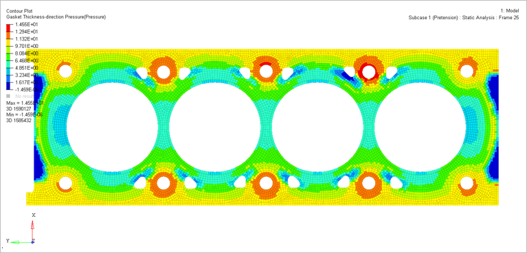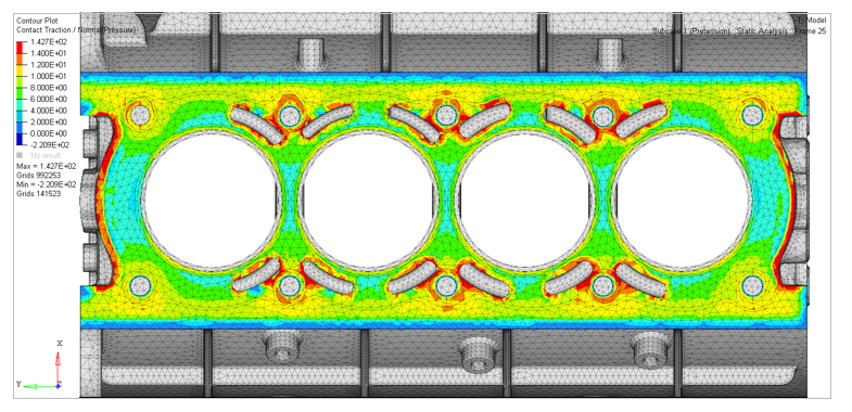 Contact-based Thermal Analysis where the conductance depends on the contact pressure/clearance. In this subcase the cylinder head bolt pretensions are locked. The objective of this subcase is to model the assembly of the engine blocks with “hot” conditions.