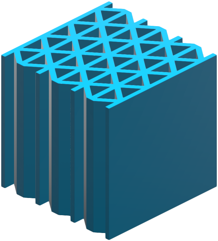 用平面格栅结构填充隐式主体,平面格栅结构是一种 2.5D 的单元结构,具有清晰定义的 2D 横截面,沿第三维绘制或拉伸。