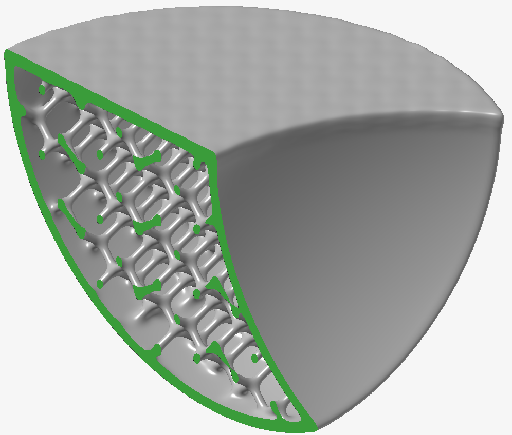 为了突出不同平滑化滤波器的优点和缺点,构建了以下测试模型。它由球形表面、平面、具有精细细节的嵌入式支柱格栅结构以及顶面上故意设计不良的纹理组成,从而在模型中留下噪声伪影。由于某些布尔运算的结果,模型中还存在高曲率区域(有些锐边和角)。绿色来自于使用剖面来显示物体内部的格栅结构。