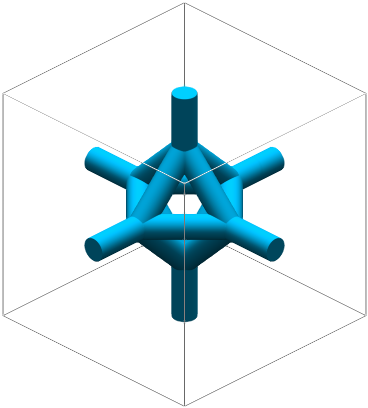 切割主体 选择用于切割壳体的主体。这可用于修剪壳体的区域,这对于将格栅结构及其壳体拟合到预定义体积中非常有用,或者当您想要显示一些格栅结构以使其不被壳体覆盖时。 在此例中,选择一个 BRep 主体作为修剪主体以暴露一些格栅结构。此图像显示了应用于格栅结构的向外壳体如何与切割实体重叠。施加切割后,一些向外壳体会被切掉,在壳体突出超过切割实体的边界的任何地方露出格栅结构。转变 选择外部主体和格栅结构主体之间的转变类型。 - 锐利:格栅结构突然地与周围的壳体相连。