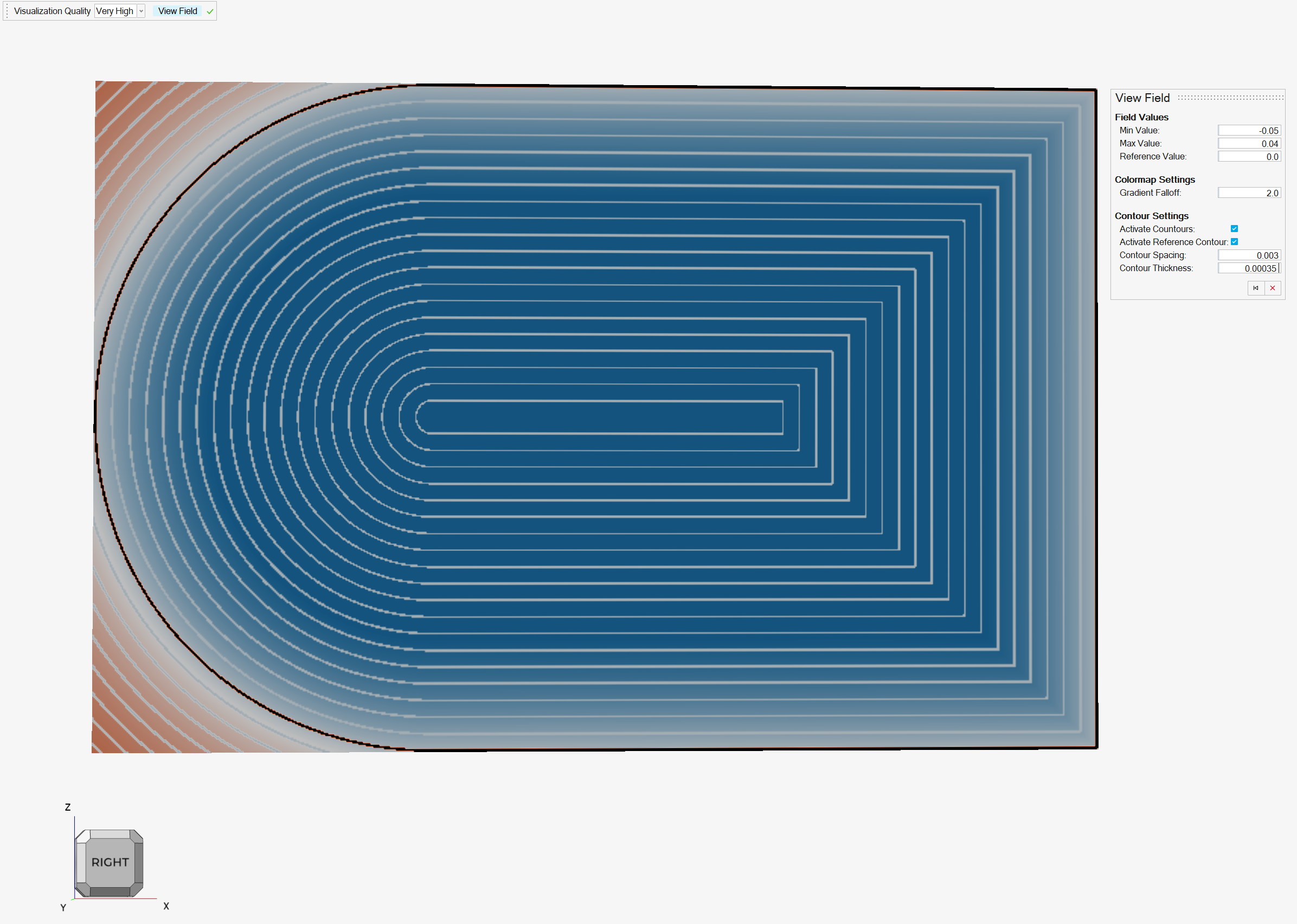 通过场值控件,我们可以设置目标场值,这些场值将由“查看场”工具进行着色和绘制轮廓。例如,我们可能只对距离表面 +/-10mm 的场值感兴趣。可以通过以下设置实现: